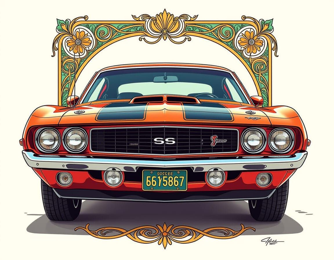 A striking picture of a hyperdetailed muscle car against a white backdrop. The design blends Art Nouveau elegance with futuristic precision and a vibrant color palette, reminiscent of a colored oil painting.