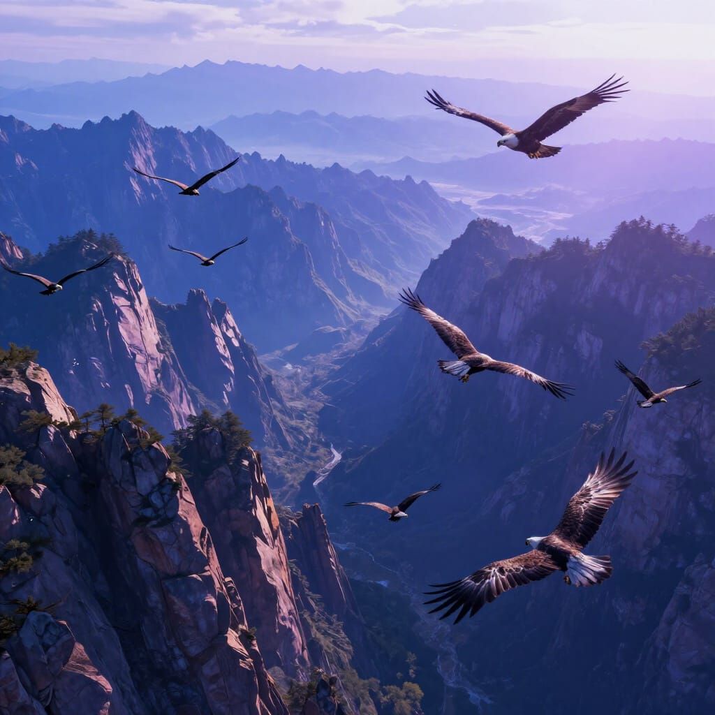 This image showcases a flock of large eagles flying high above dramatic mountains and cliffs, depicted in a soft, hazy, and dreamlike digital matte painting style with rich colors and sharp highlights.