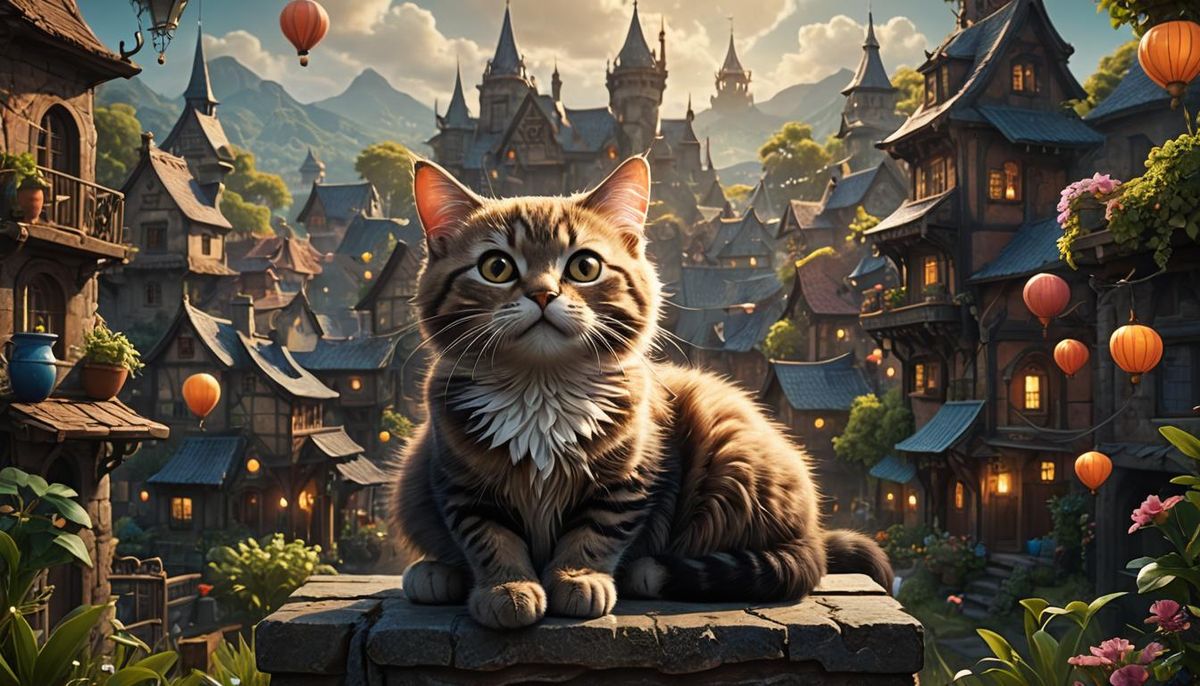 This image shows the concept of happiness embodied in a cat. The scene is a detailed matte painting with deep colors and intricate details, in a fantastical style.