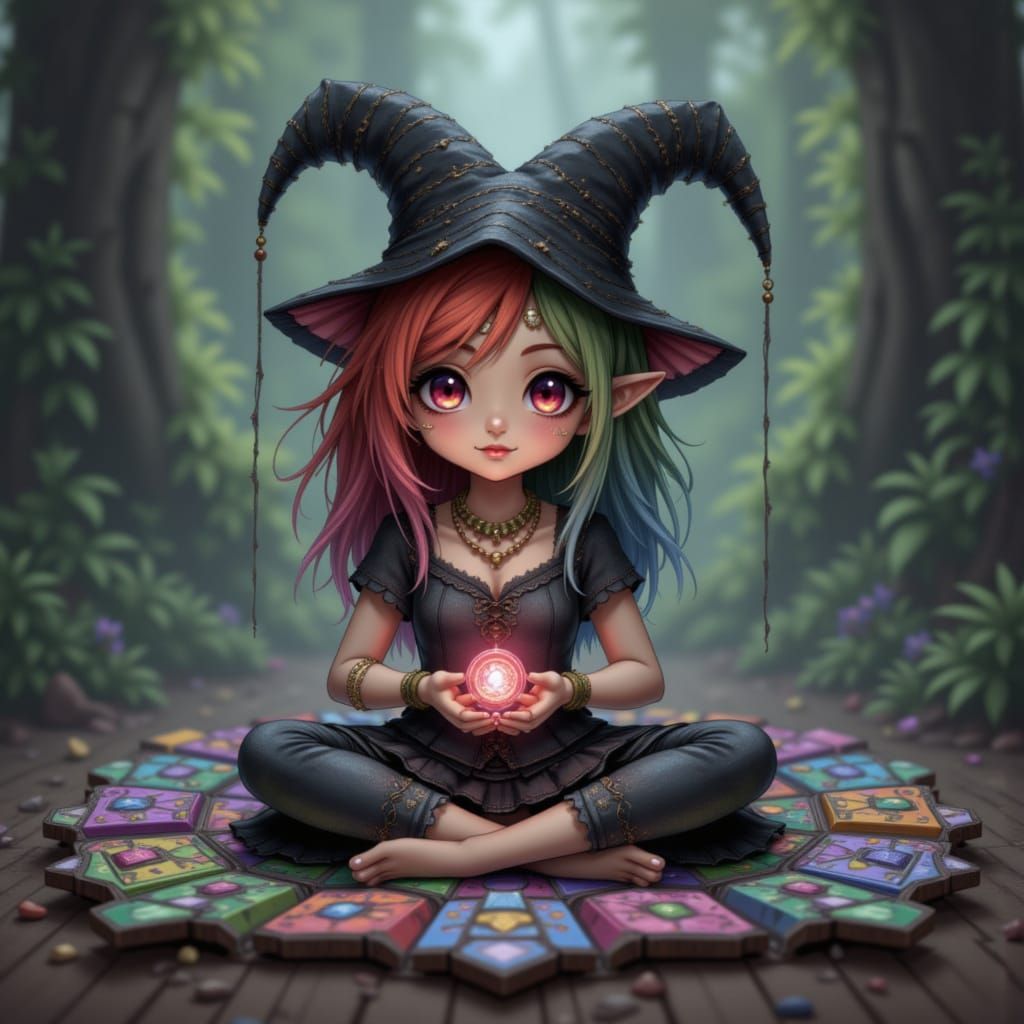 This incredibly detailed image shows a gothic academia pixie sitting on a Ouija board, holding an oracle piece. Features surreal and dream core aesthetics.