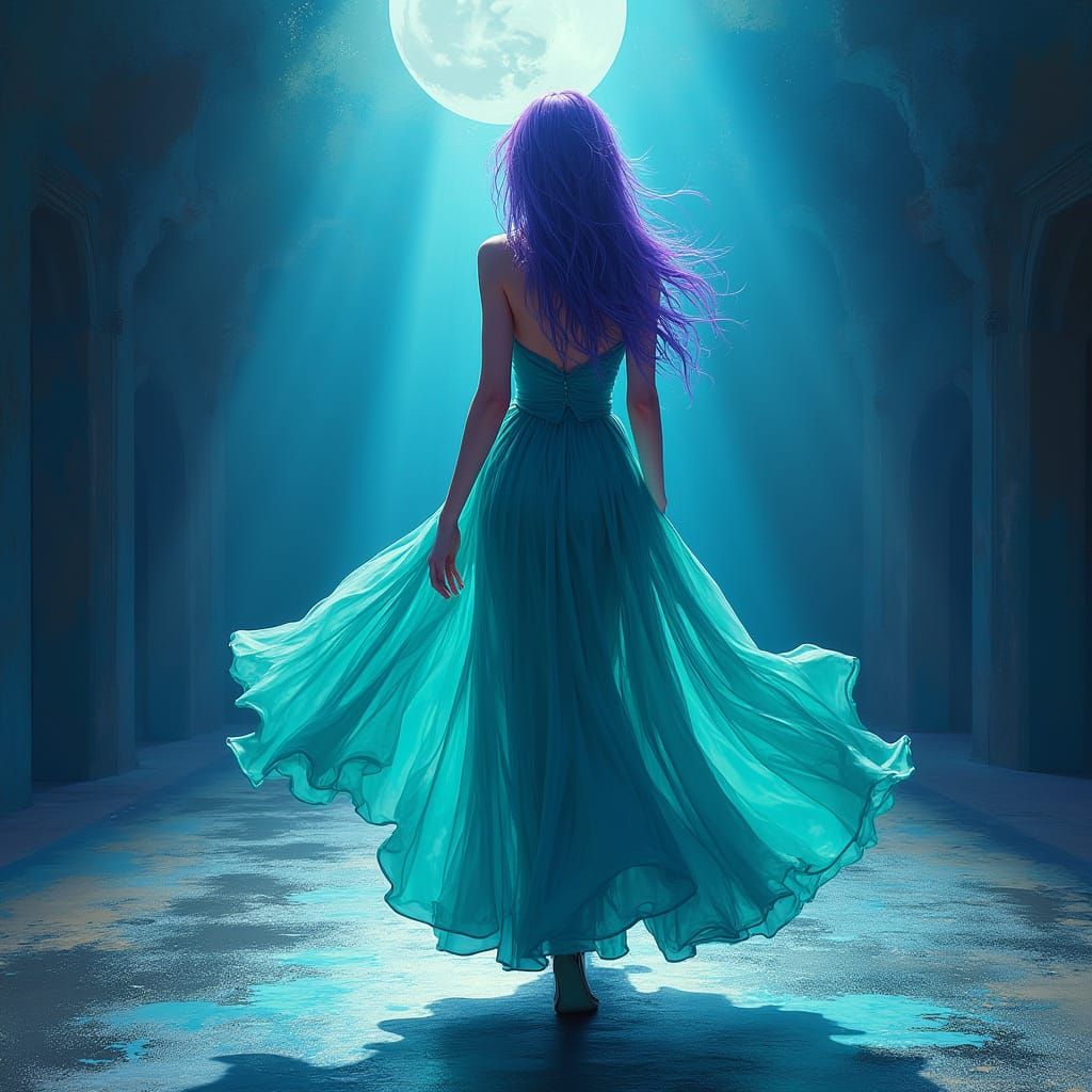 This image captures a stunning woman in a flowing blue-green dress, confidently walking down a catwalk under the soft glow of moonlight. Her porcelain skin and icy blue eyes are perfectly complemented by her vibrant attire, which is adorned with bold, colorful graffiti art details.