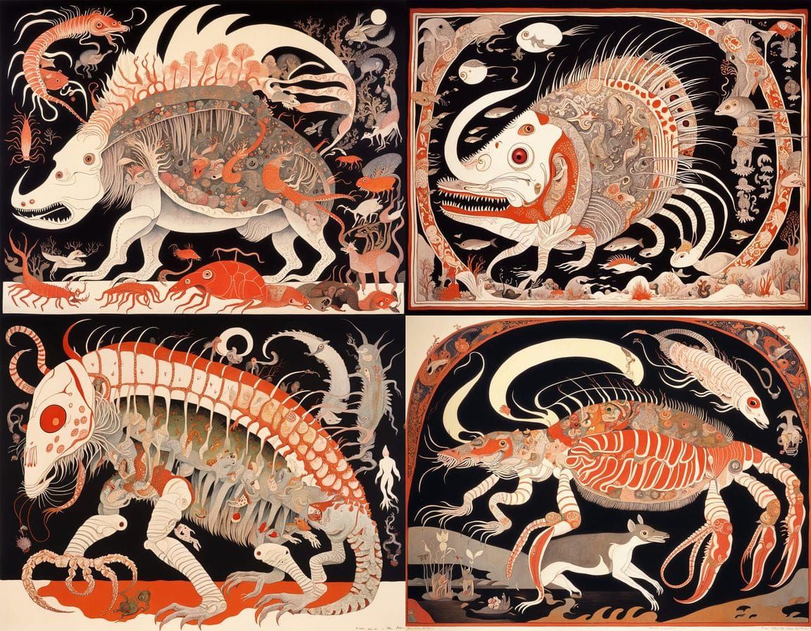 This image depicts a nightmarish sea creature with its internal organs exposed, set against a surreal and disturbing backdrop.