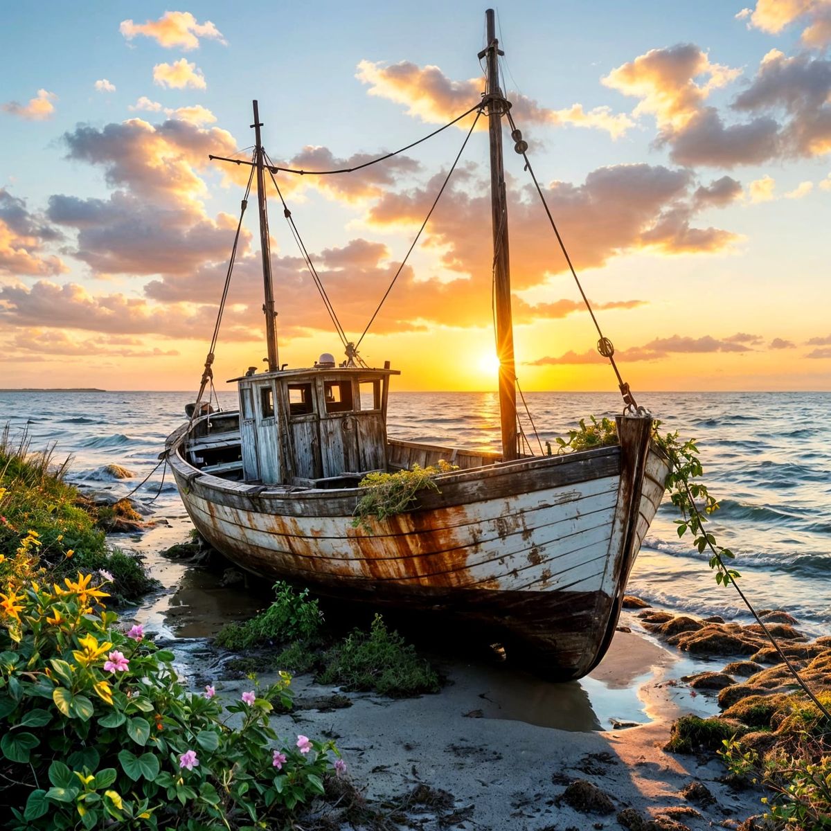 A vintage sailboat rests at an angle on a verdant, overgrown shore as the sun sets. Sparkling waters and golden reflections enhance the dreamy, melancholic scene in soft digital watercolor style.