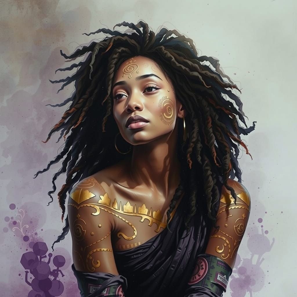 A striking picture of a young woman with dreadlocks and dark skin, gazing upwards. Golden patterns decorate her face and shoulders. The artwork features lush textures and luminous lighting.