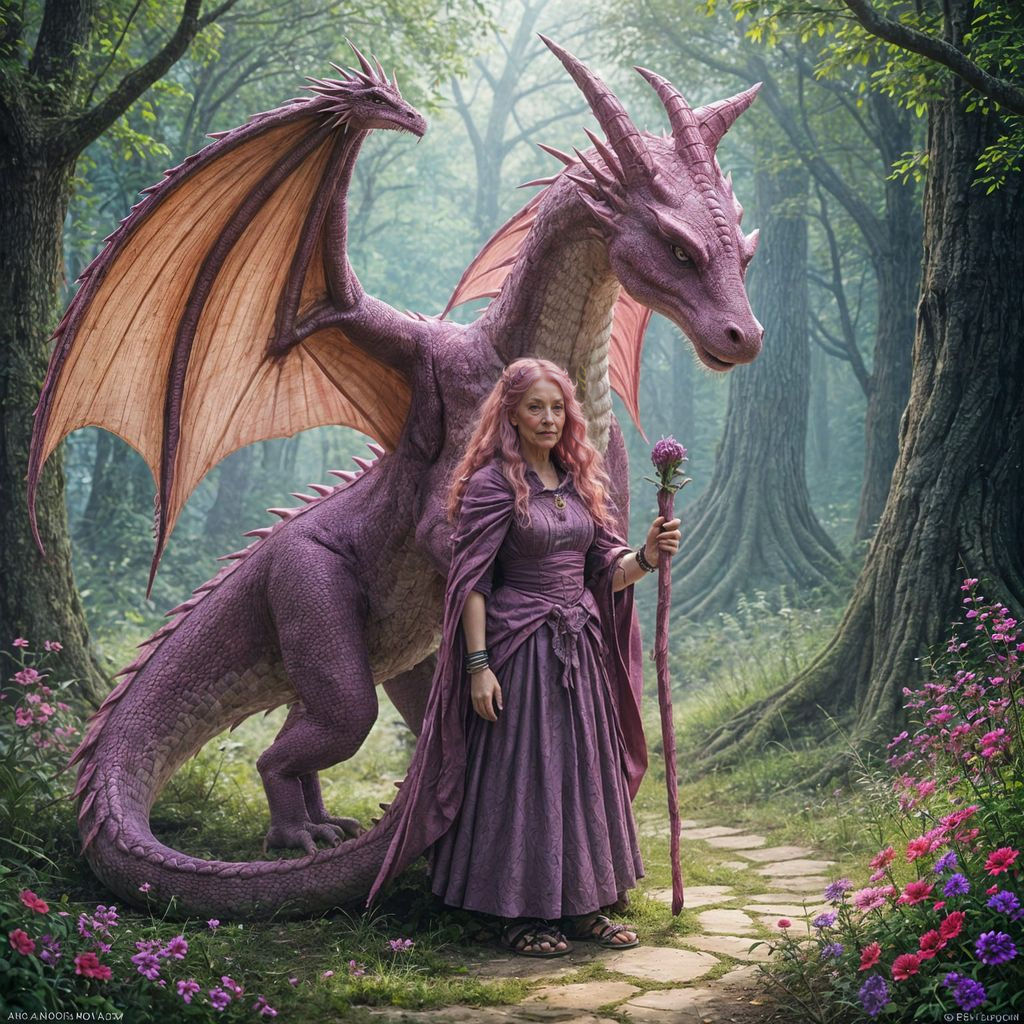 This enchanting image depicts a majestic pink and purple dragon in a serene forest clearing, accompanied by an elderly woman with pink hair, creating a whimsical and dreamlike atmosphere.