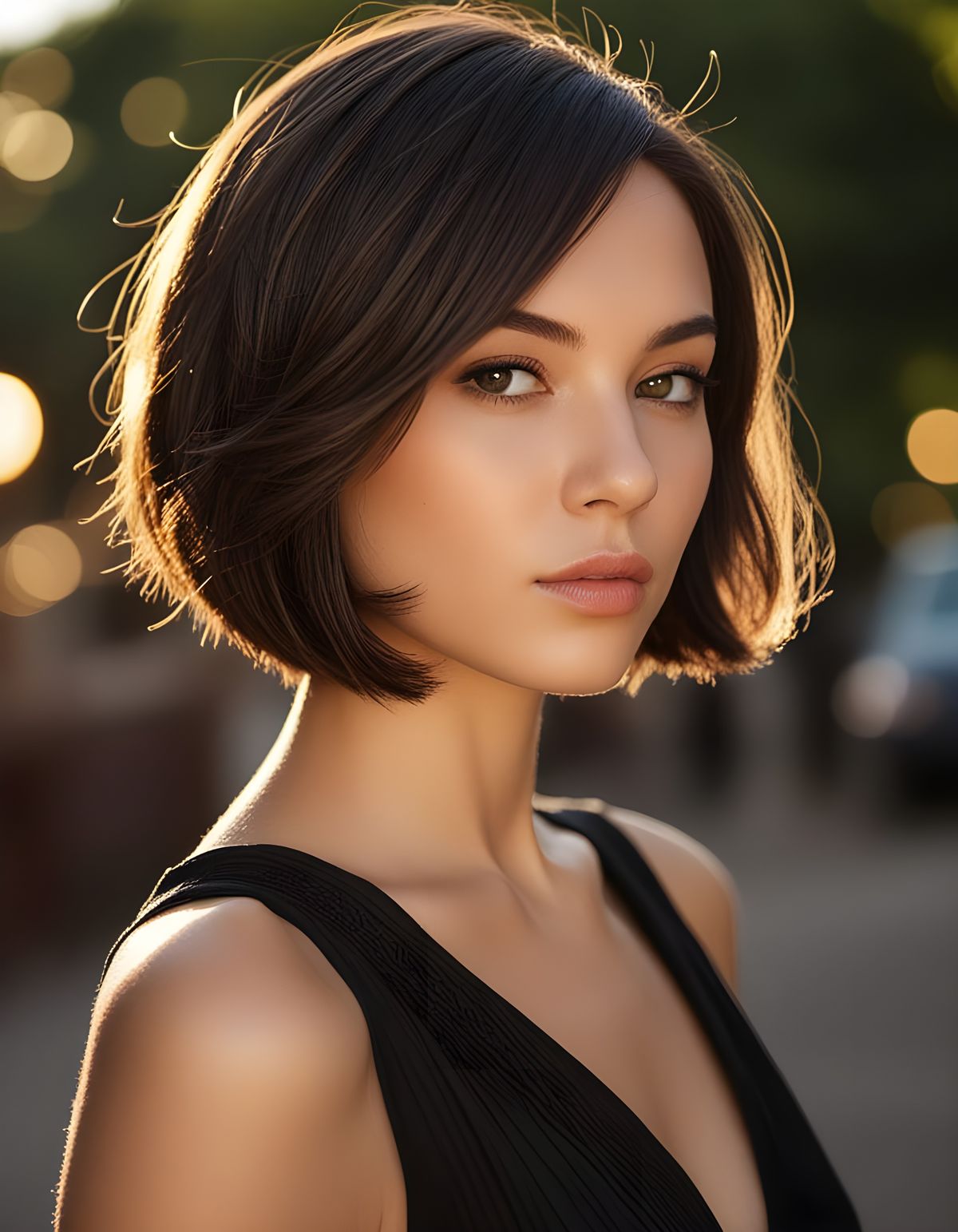 A striking picture of a woman with a bob haircut in a black dress. The side view shot features soft studio lighting, realistic skin details, and a high-fashion editorial aesthetic.