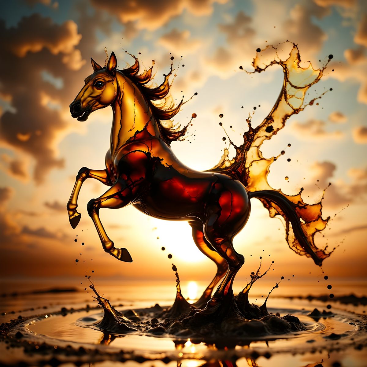 A photorealistic image of a leaping horse formed from splashing coffee. The coffee splash horse is transparent with a back lit glow, incorporating surreal hyperdetailed elements.