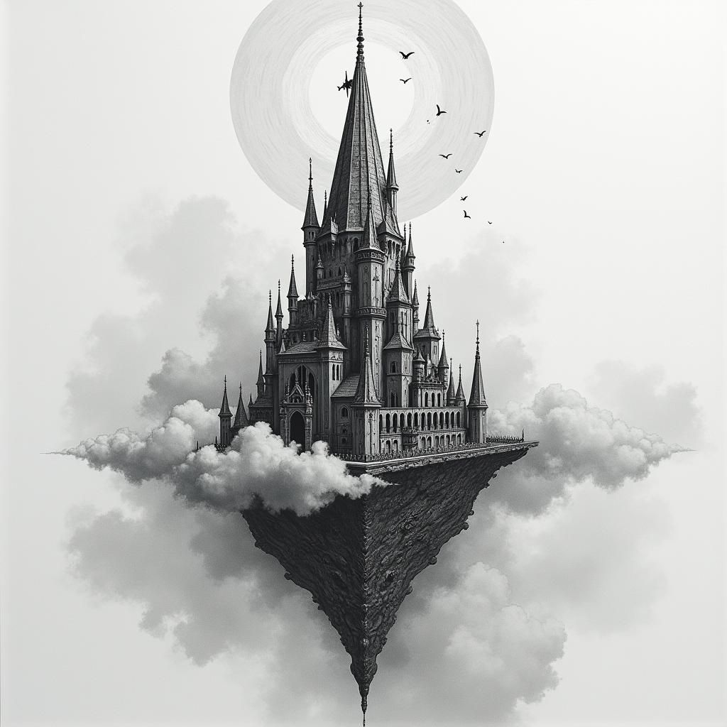 A floating wizard tower amidst swirling clouds. This image showcases intricate architecture with mystical runes, set against a soft gradient background. Rendered as a hyperdetailed charcoal drawing.