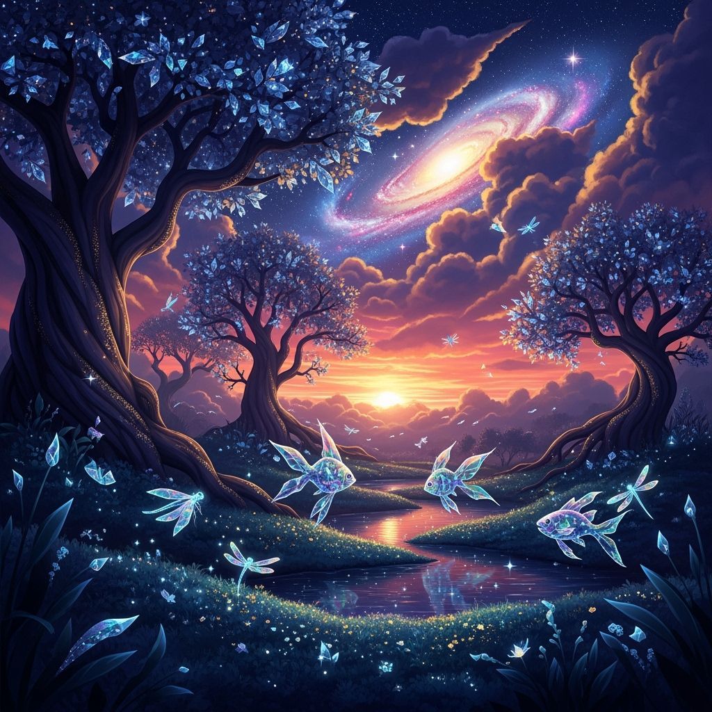 This image shows an enchanted forest at twilight with trees that have crystalline leaves. Refracted starlight scatters shimmering light across the forest floor, creating a mystical, dreamlike ambiance.