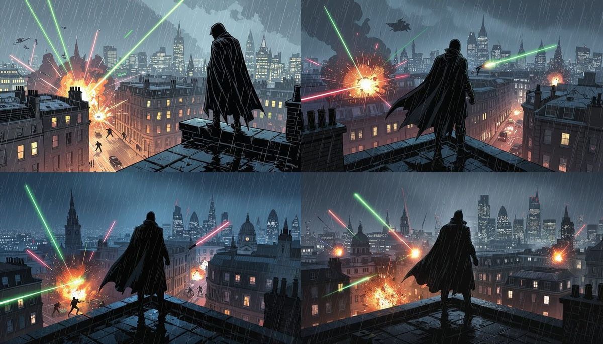 This image shows a cloaked figure on a wet London rooftop at night, with a battle unfolding below. Dramatic lighting and bold outlines enhance the comic book art style.