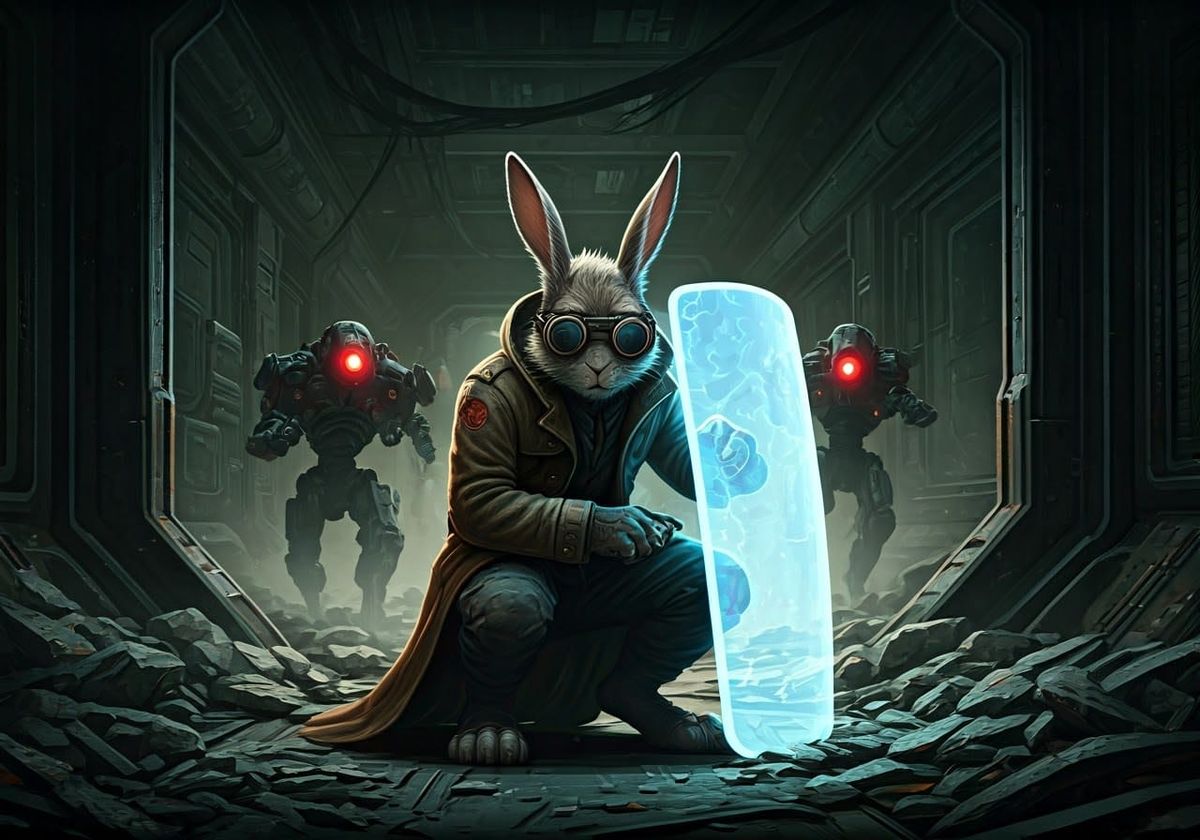 An anthropomorphic rabbit uses cloaking technology to hide from cyborg units hunting him down on an abandoned space station.