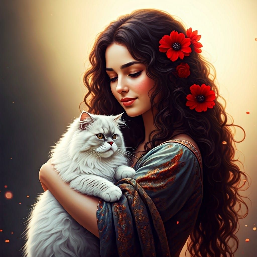 A captivating image of a woman holding a white Persian cat. The scene is fantasy concept art with golden light, rich colors and intricate details. The style evokes a magical aesthetic.