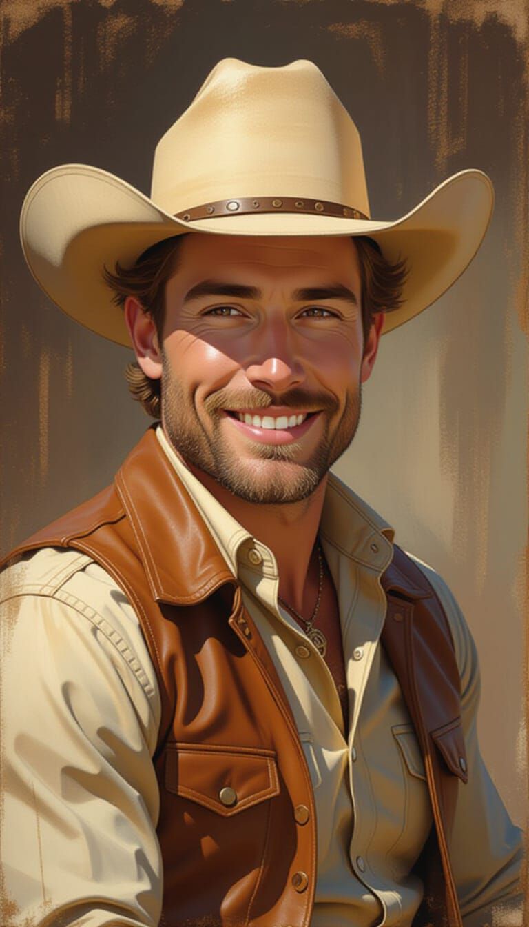 This image depicts a ruggedly charming cowboy with an athletic build and warm eyes, presented in a realistic oil painting style with cinematic lighting and a rich color palette.