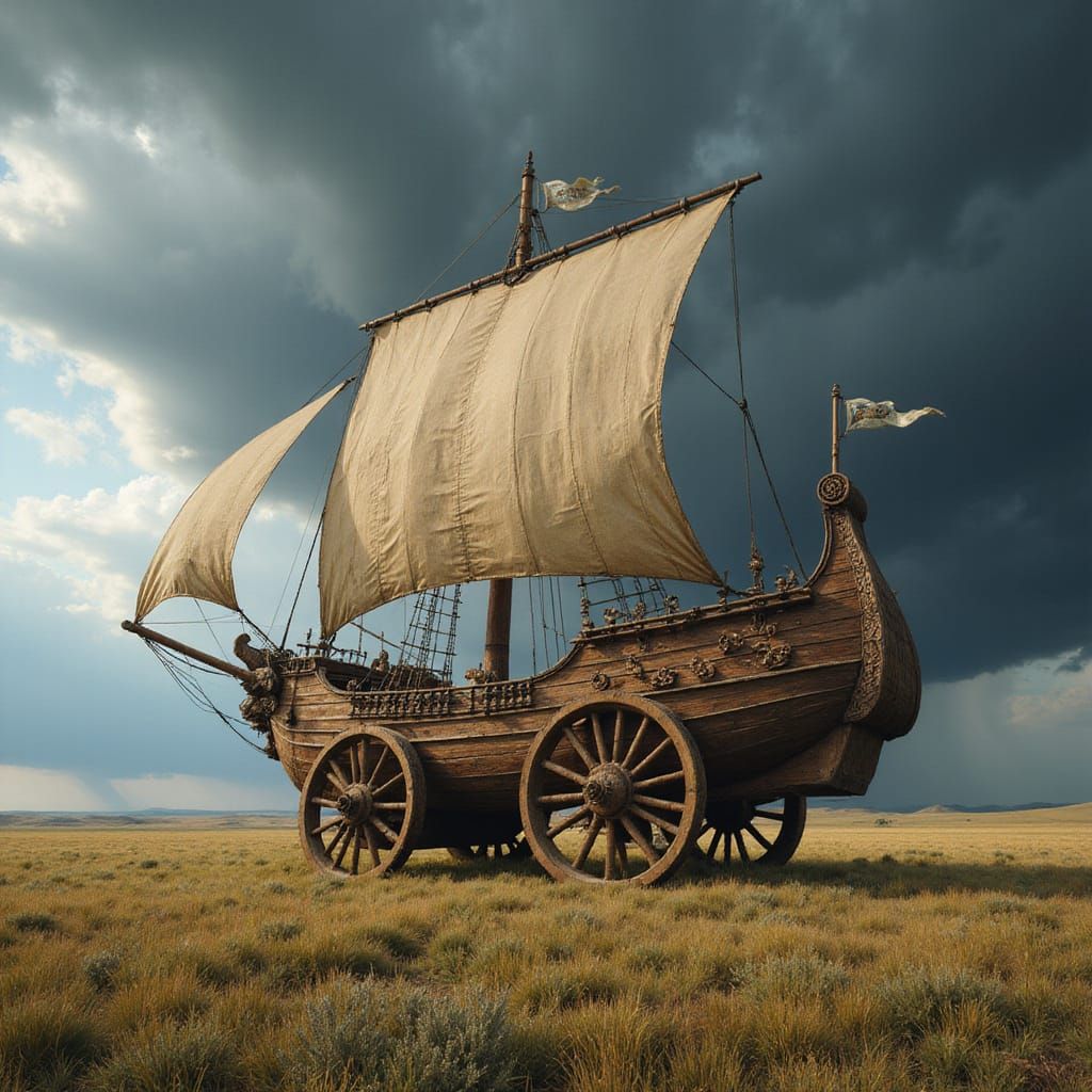 A captivating image of a wooden sailing ship moving across a prairie on giant wooden wheels as a thunderstorm looms. The artwork features a detailed matte painting style and complementary colors.