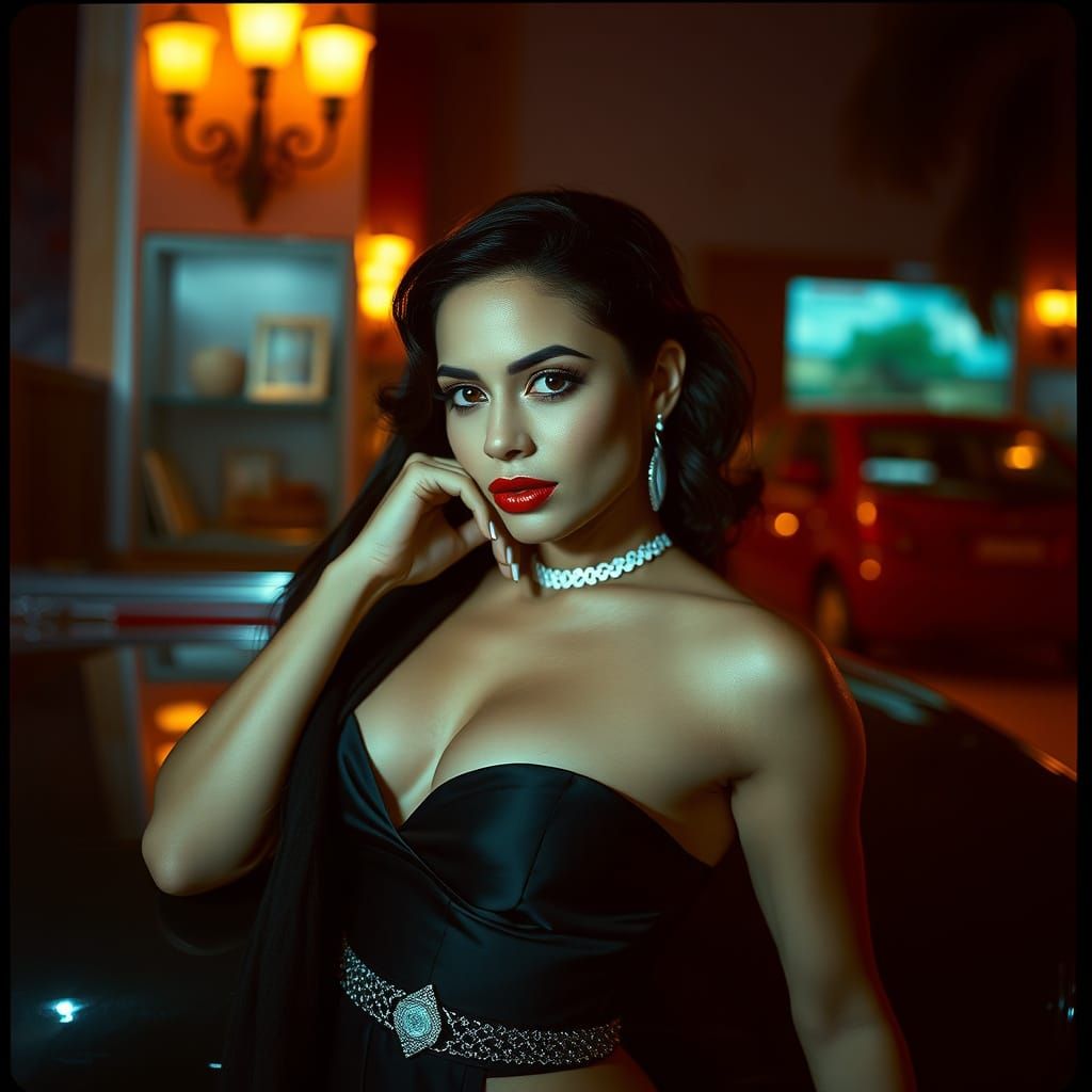 This image shows a sensual Cuban woman in elegant attire, posing in a dramatic, atmospheric setting. The image is reminiscent of classic film photography.