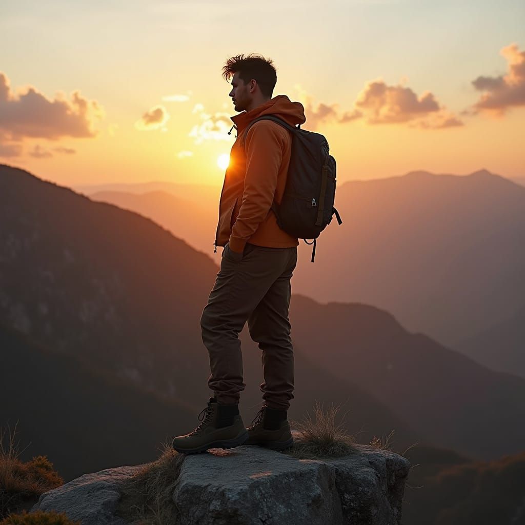 A man in outdoor clothing stands on a cliff at sunset. The wind catches his hair as he gazes at the horizon. Golden sunlight bathes the scene in natural, earthy tones. Ultra-realistic digital art.