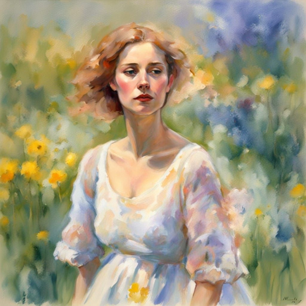 A delicate watercolor painting of a woman dancing on a summer night. Impressionistic style with soft lighting and pastel colors create a dreamy, ethereal atmosphere.