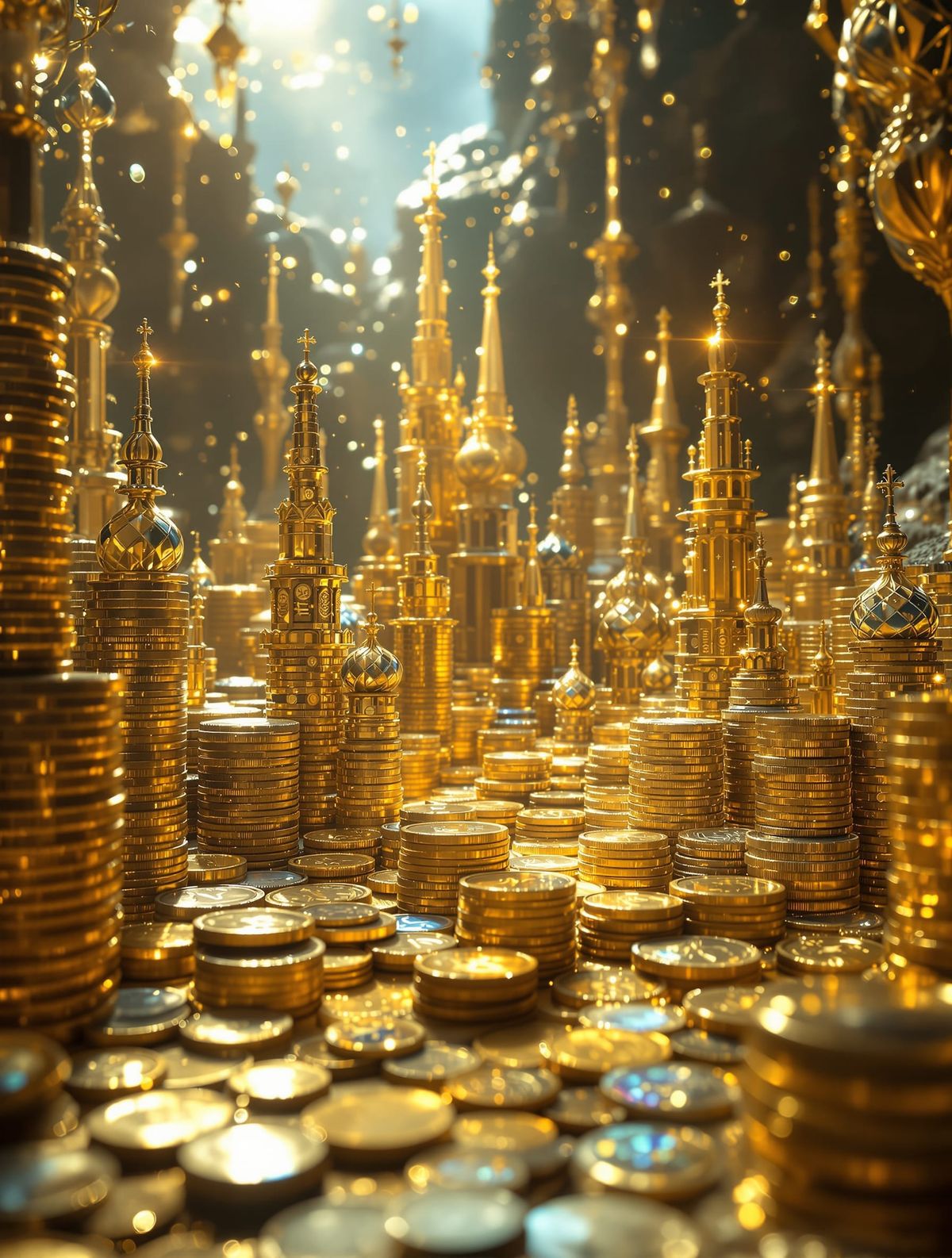 Maximalist concept art. A sprawling, opulent city built from stacks of gold coins and shimmering banknotes, bathed in dramatic, ethereal light. Intricate architectural details, towering spires adorned with currency symbols. Hyperrealistic rendering, detailed textures of metal and paper. A sense of ancient ...