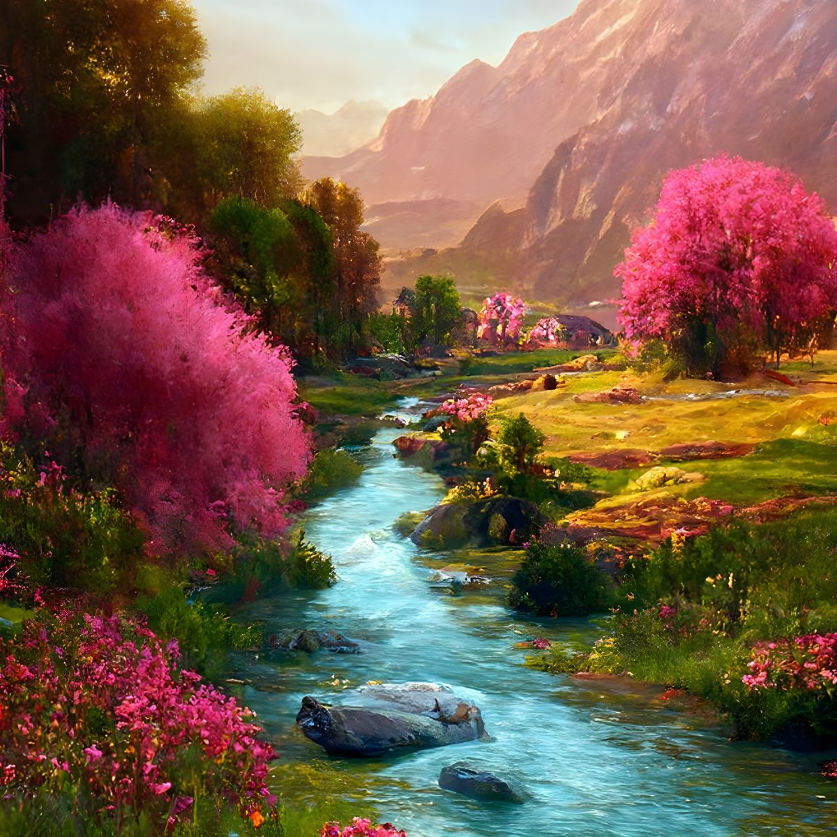A vibrant valley landscape featuring a river and distant mountains. This image shows an idyllic, realistic scene with pink and white flowers, evoking a vintage photography aesthetic.