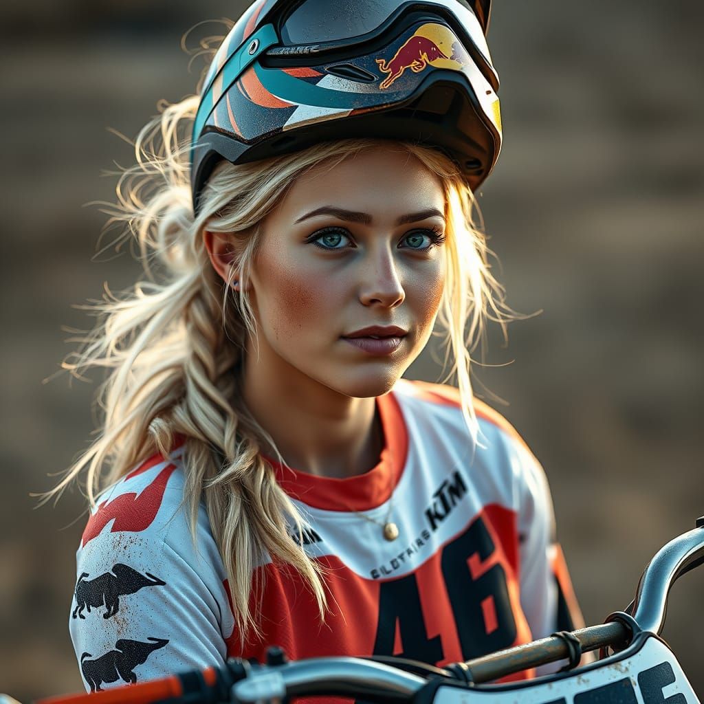 This image shows a blonde motocross rider pausing, captured in ultra-photorealistic 8K. The portrait highlights details like dirt streaks, platinum hair, and custom gear under golden hour lighting.