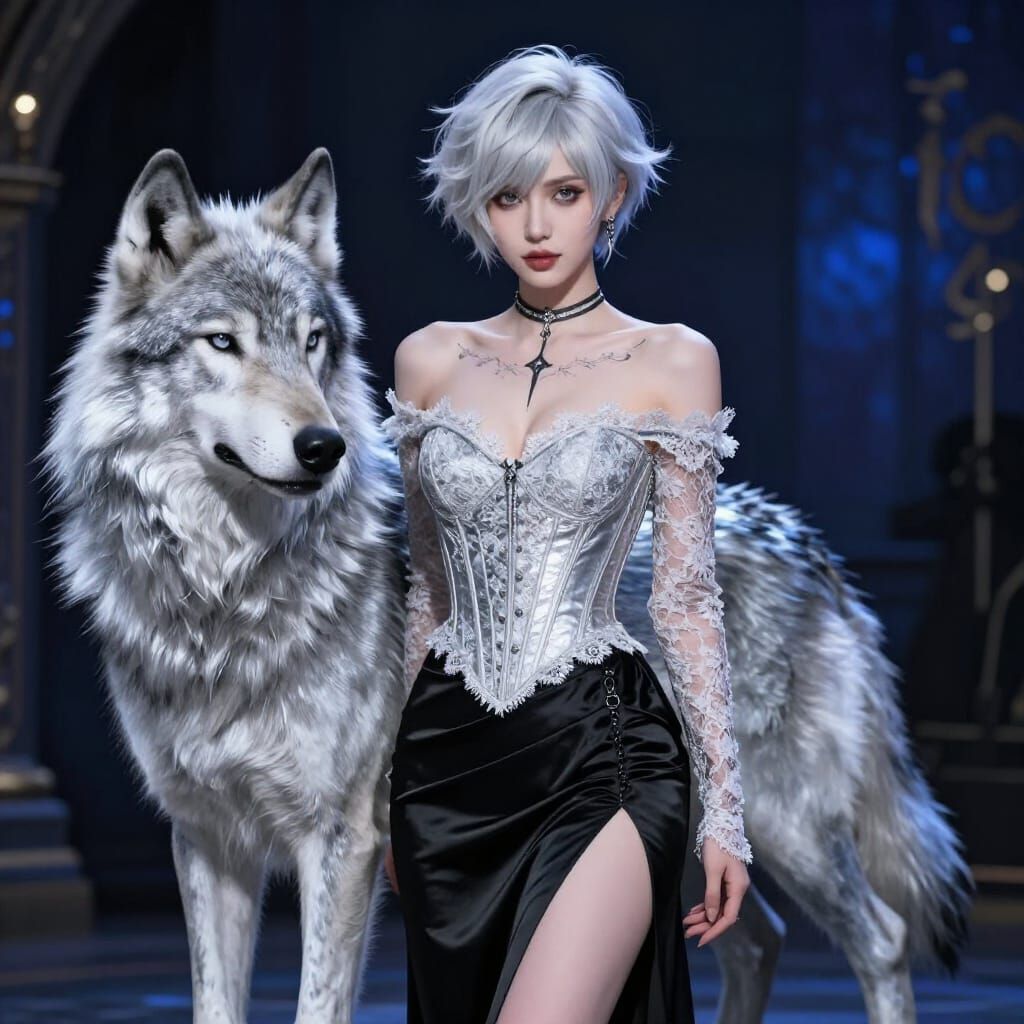 A dark fantasy scene of a woman with a silver pixie cut and striking attire, accompanied by her dire wolf. Features cinematic lighting and a dramatic color palette.