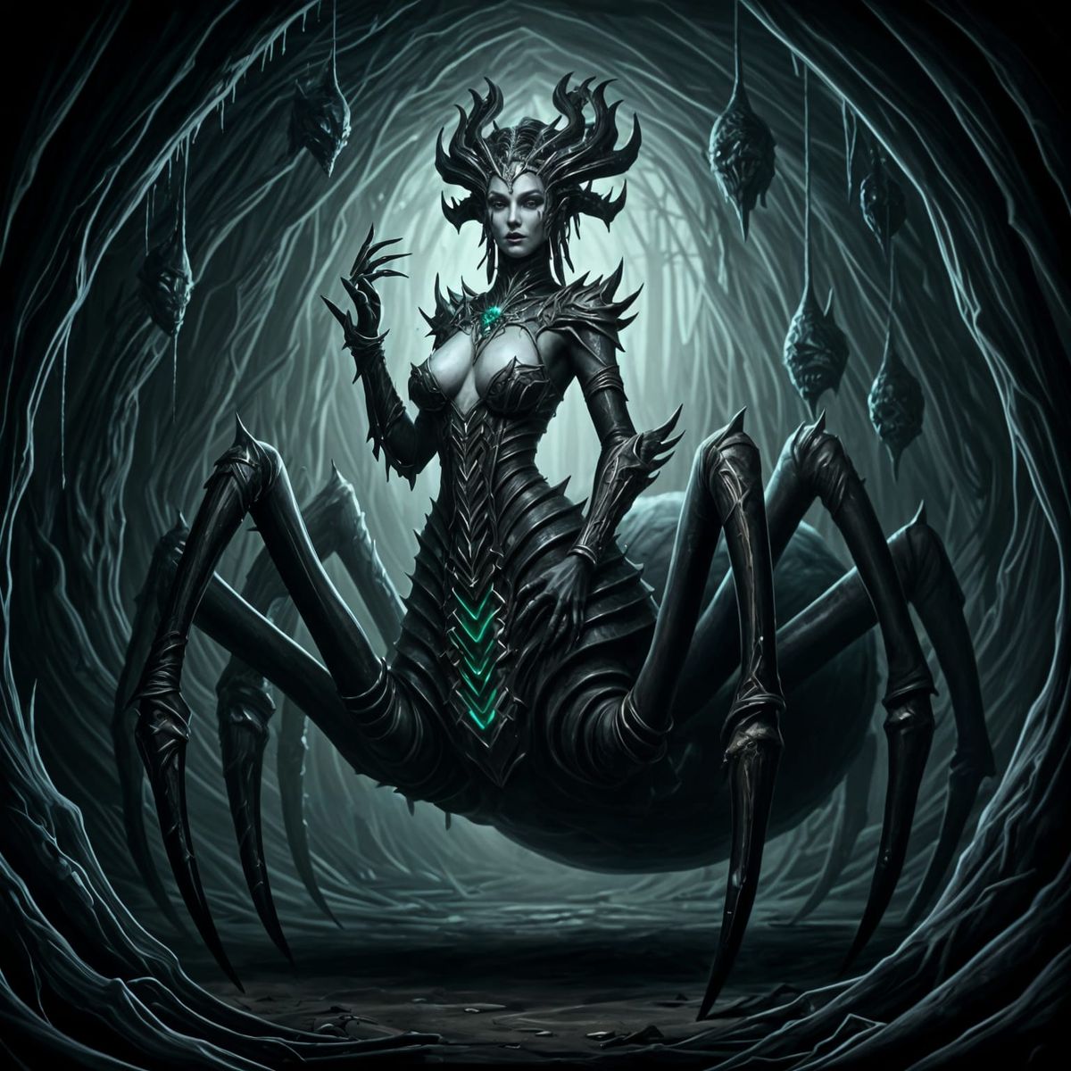 This image shows a striking female drider with obsidian skin and venom-stained lips, adorned with jewelry made of fangs and spider eggs. Shadow tendrils curl around her in forgotten tunnels.