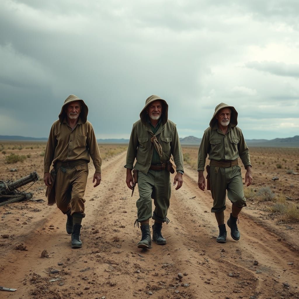 This image shows three gaunt peasants walking through a barren, cracked landscape under a gloomy sky. The scene is depicted in an apocalyptic style, using detailed textures to evoke despair and abandonment.