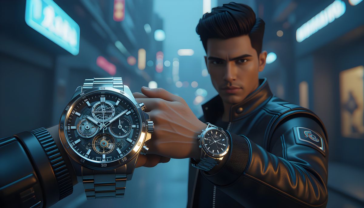 This image shows a stylish Indian boy wearing a futuristic watch. The close-up shot, rendered with polished metal effects, features intricate mechanical details and a dramatic, cinematic background.