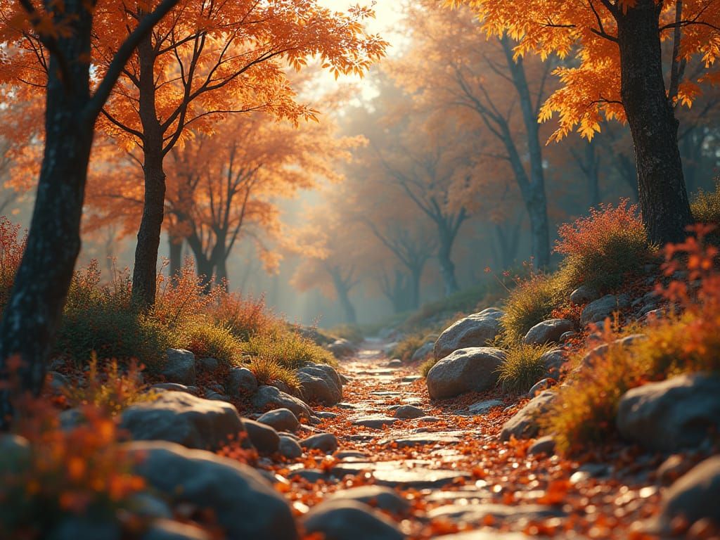 This image showcases a hyper-detailed, photorealistic portrait of a fantasy land during autumn. Rendered with maximalist detail, soft lighting, and surreal elements, it offers breathtaking cinematic quality.