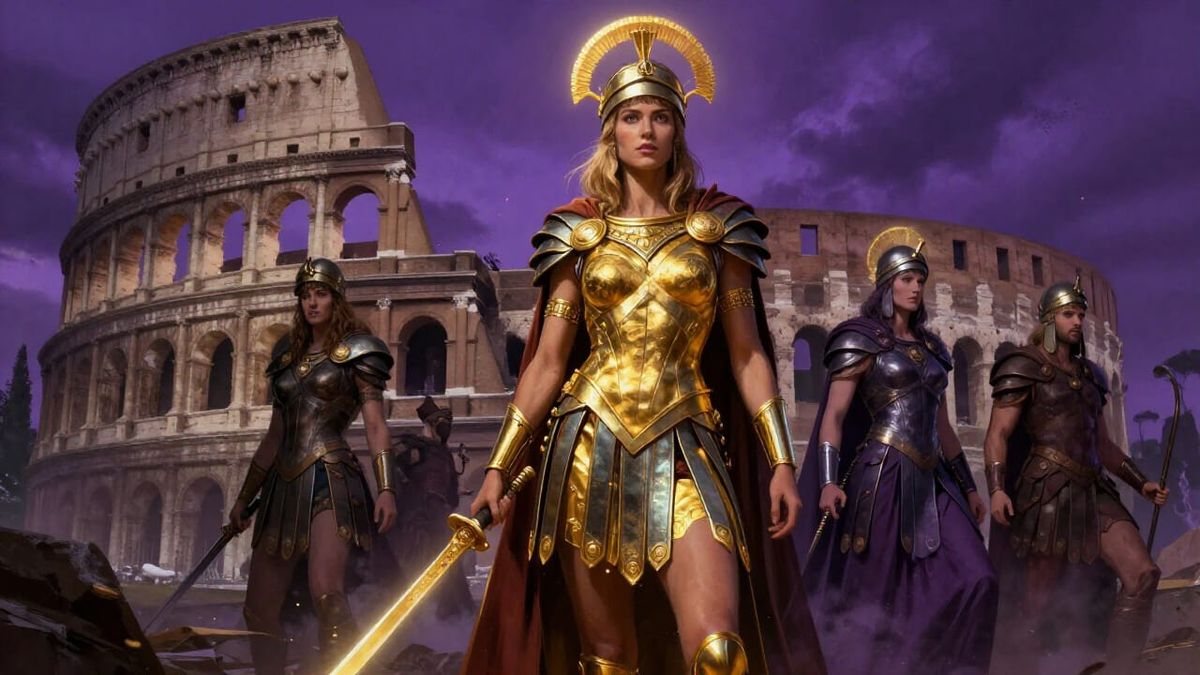 This image shows a powerful female gladiator in ornate armor, standing victorious in ancient Roman ruins. Dramatic lighting and vivid colors enhance the dark fantasy concept art style.