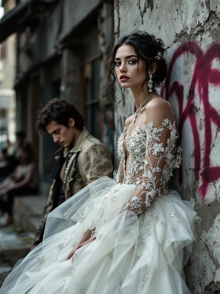 This image showcases a modern interpretation of decay within the American dream. The high-fashion romantic drama features luxurious fabrics, intricate embroidery, and delicate embellishments in a fusion of softness and strength.