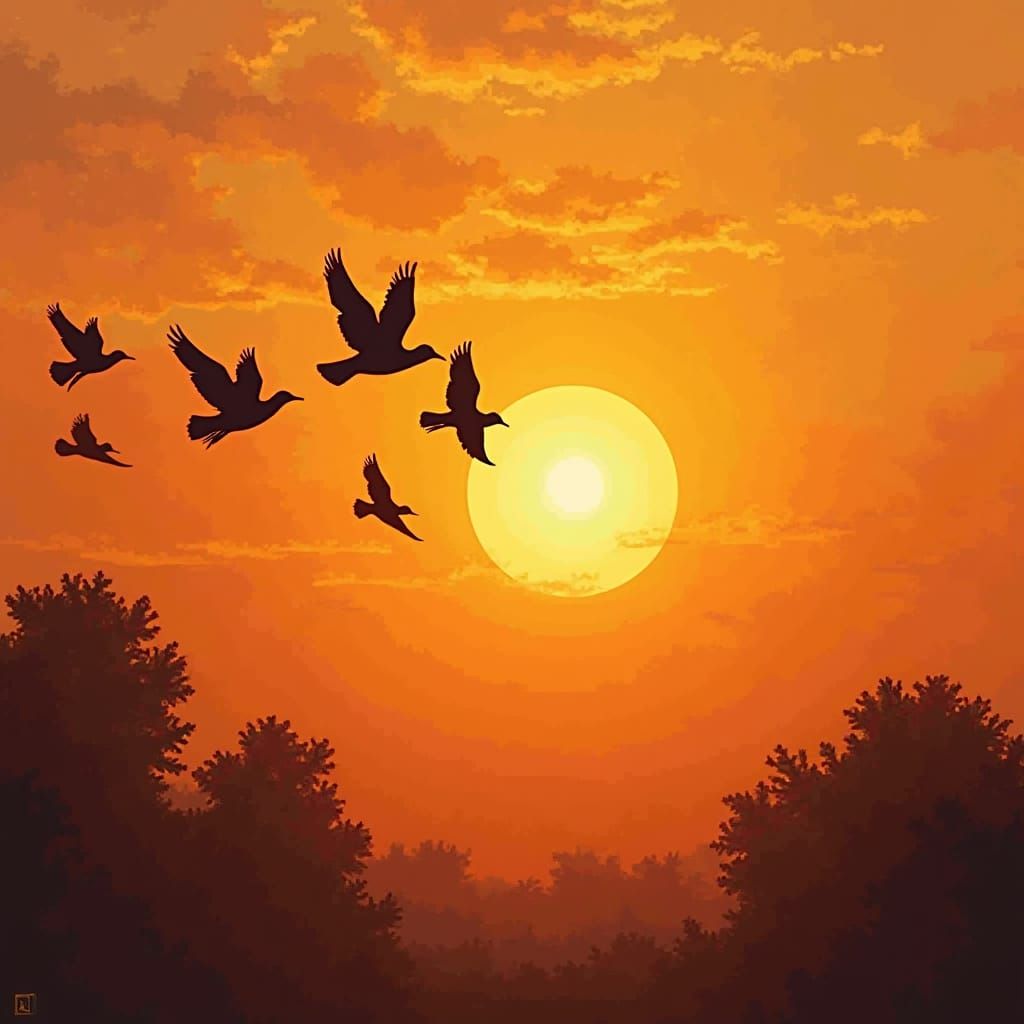 A striking picture of silhouetted birds soaring across a golden sunrise. This image captures the serene beauty of nature with warm hues and fine details, reminiscent of classical landscape paintings.