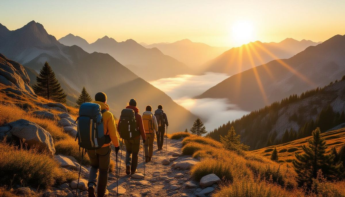 This image shows a group of hikers on a rocky mountain trail, with glowing golden sunlight over misty valleys. The landscape is captured with vibrant warm tones and a cinematic feel, reminiscent of classic landscape photography.