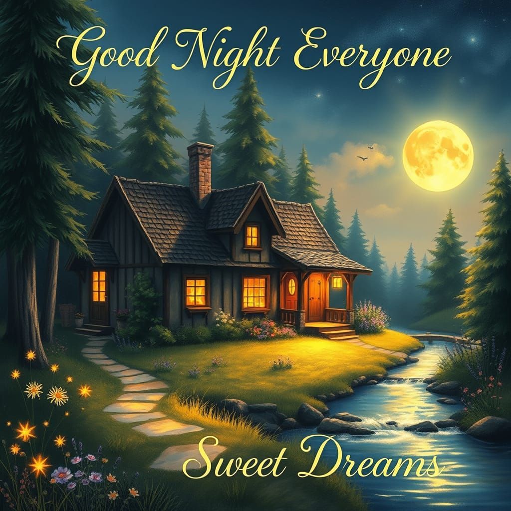This serene painting depicts a peaceful country cottage nestled among tall trees, surrounded by a winding path lined with fireflies and wildflowers, under a starry night sky. The warm, golden light emanating from within creates a sense of tranquility, reminiscent of traditional, painterly styles.