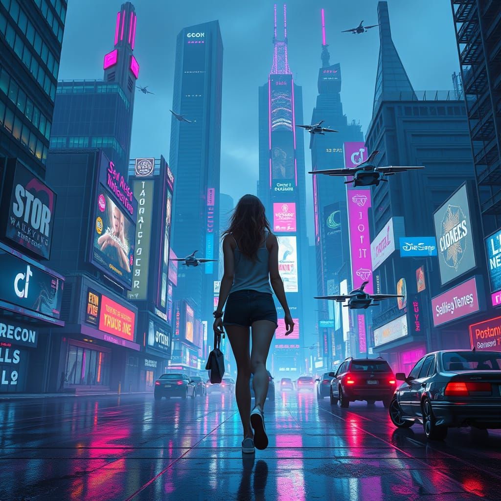 A futuristic city comes alive at night with chrome skyscrapers, neon lights, and holographic ads, amidst flying vehicles, in a blend of cyberpunk and dystopian realism.