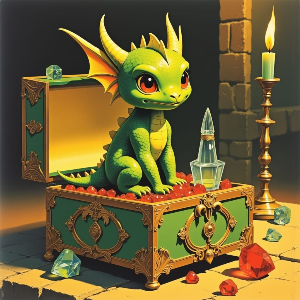 This image shows a delicate, ornate jewelry box overflowing with glittering glass jewels, home to a tiny, scale-covered baby dragon with big, round eyes and a mischievous grin, surrounded by warm, nostalgic lighting reminiscent of classic 1970s fantasy illustrations.