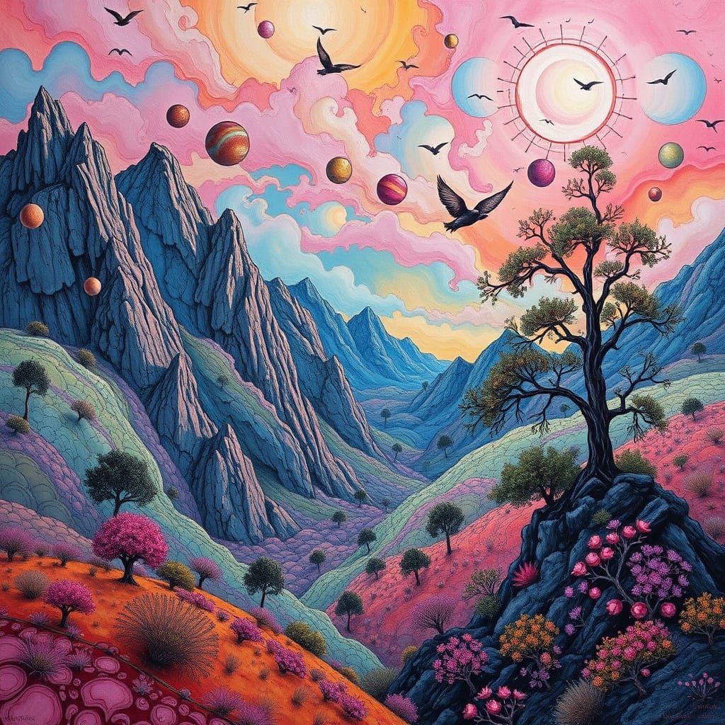 This image shows a surreal and intricate modern European ink painting with pastel colors. The artwork exhibits a unique blend of geographic ambiguity in an ultraweird style.