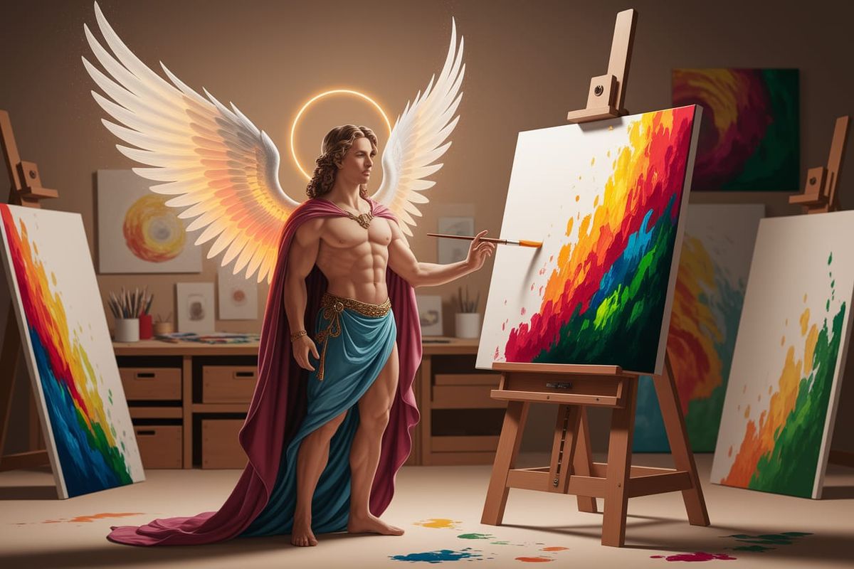 This image shows Archangel Gabriel, the angel of creativity, painting a colorful masterpiece in a softly lit studio filled with art supplies and partially completed works. The scene is infused with a divine aura and symbolizes the power of creativity.