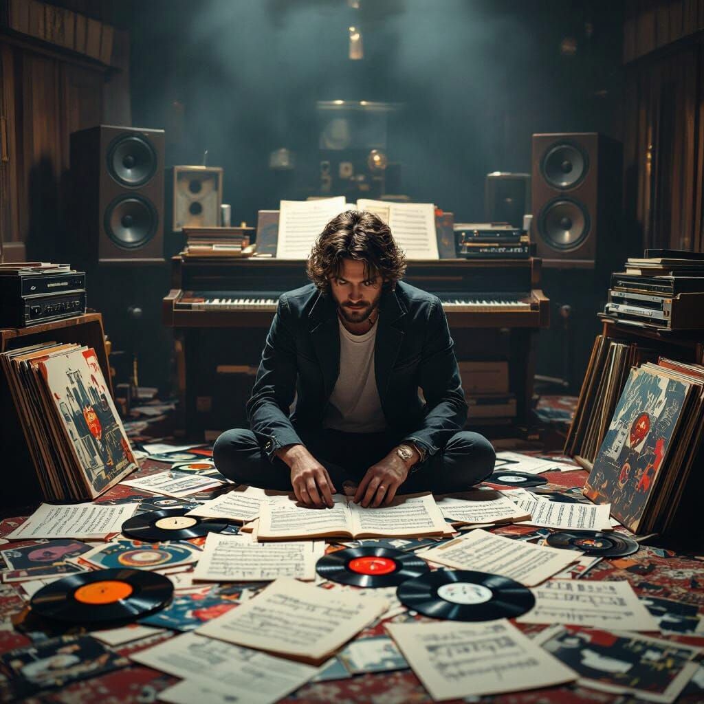 This image shows a musician in a vintage recording studio surrounded by music sheets and vinyl. The image has a nostalgic, retrofuturistic feel with industrial aesthetics.