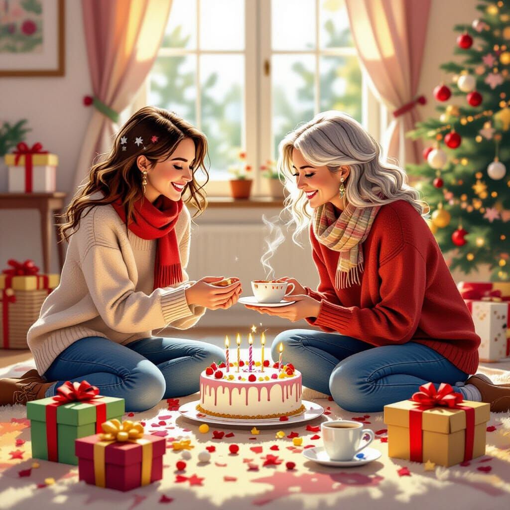 This image depicts a heartwarming 18th birthday party scene. Gifts are scattered, a cake and coffee are ready, with a loving aunt and godmother offering congratulations in a whimsical illustration style.