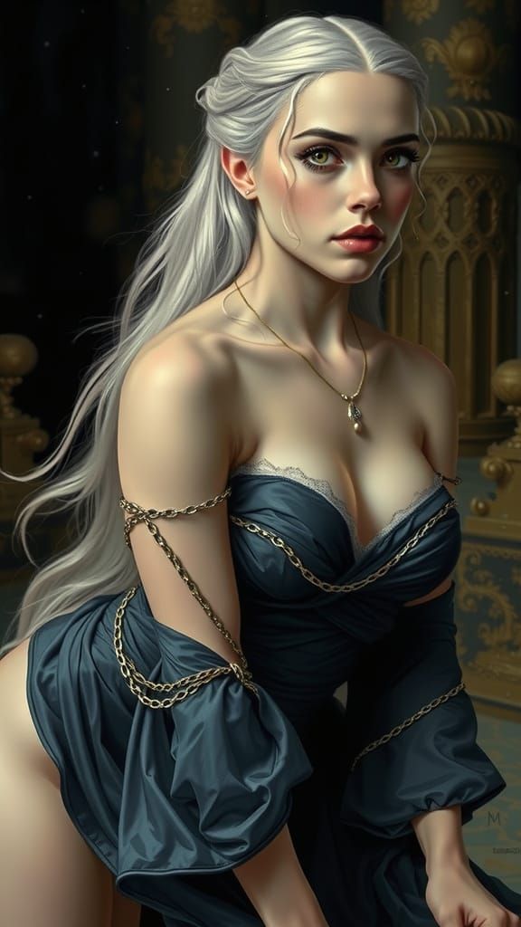 This enchanting image captures a Targaryen woman bathed in soft, ethereal light, her silver hair flowing like a river of moonlight, and her toned figure adorned with delicate chains, exuding a captivating, otherworldly aura.