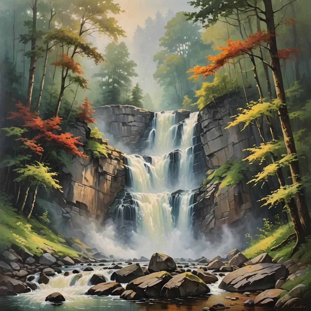 This image shows a picturesque double waterfall nestled in a lush forest. The scene is rendered as a vibrant oil painting, complete with hazy mist and rich colors.