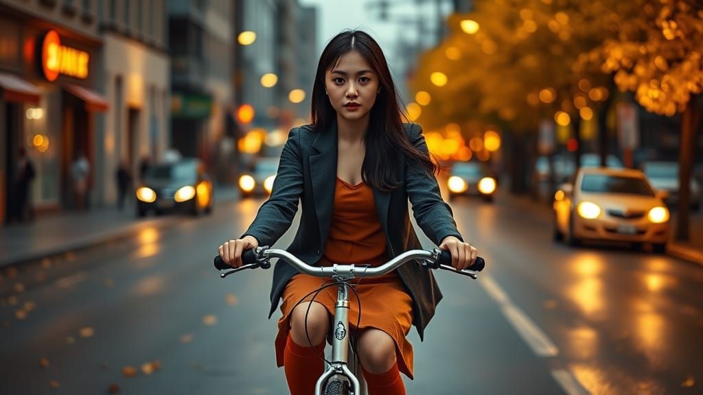 This image shows a young woman cycling on a wet city street during autumn. Warm golden light and fallen leaves create a tranquil, melancholic atmosphere with urban elegance.