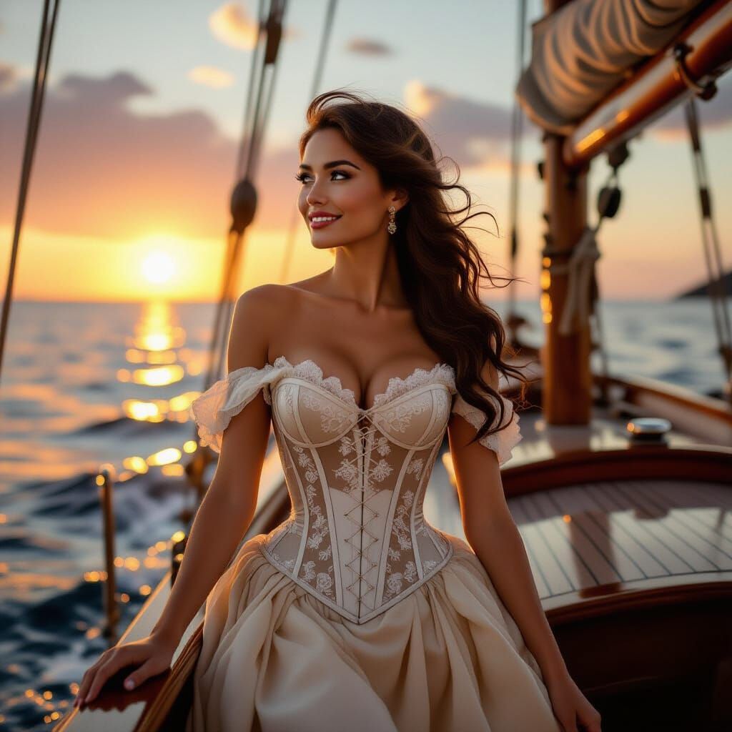 This image shows a woman in a vintage corset and skirt on a sailboat. The serene sunset reflects on the calm sea as she gazes at the horizon in a photograph with cinematic lighting.