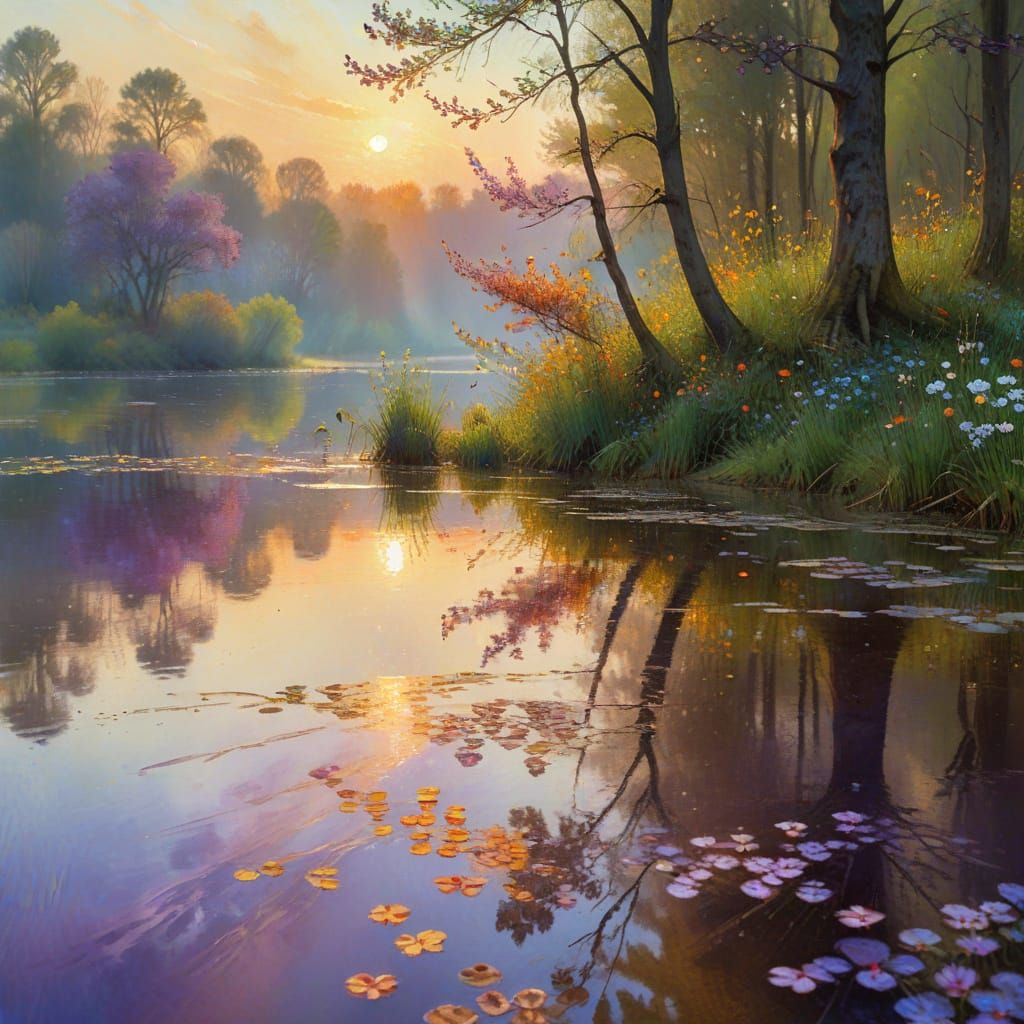 This image shows a breathtaking spring landscape with trees in soft focus reflecting in a serene lake at sunset. The painting combines the styles of Impressionist masters, featuring iridescent colors and intricate details in a shimmering atmosphere.