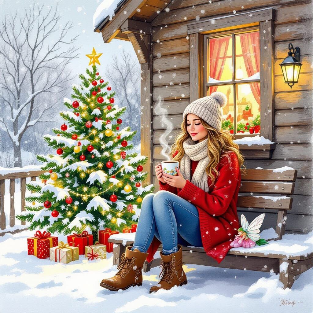 This image shows a young woman enjoying tea on a porch near a Christmas tree. The scene evokes Beatrix Potter's style, with gouache details and visible brush strokes. A tiny fairy sits on a mushroom in morning light.