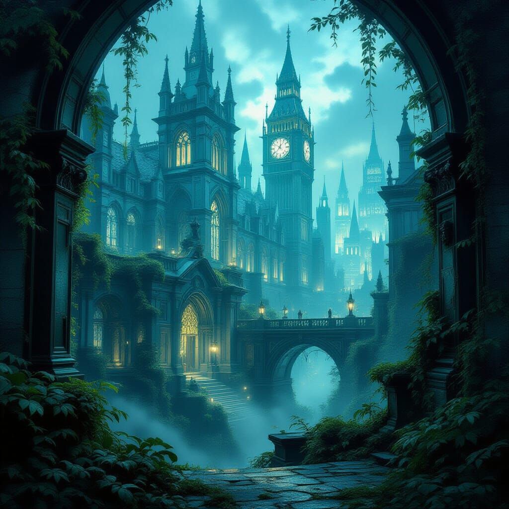 This digital matte painting depicts the central district of London as an overgrown ruin, infused with mystical light and bioluminescent flora. It captures ancient grandeur and forgotten magic.