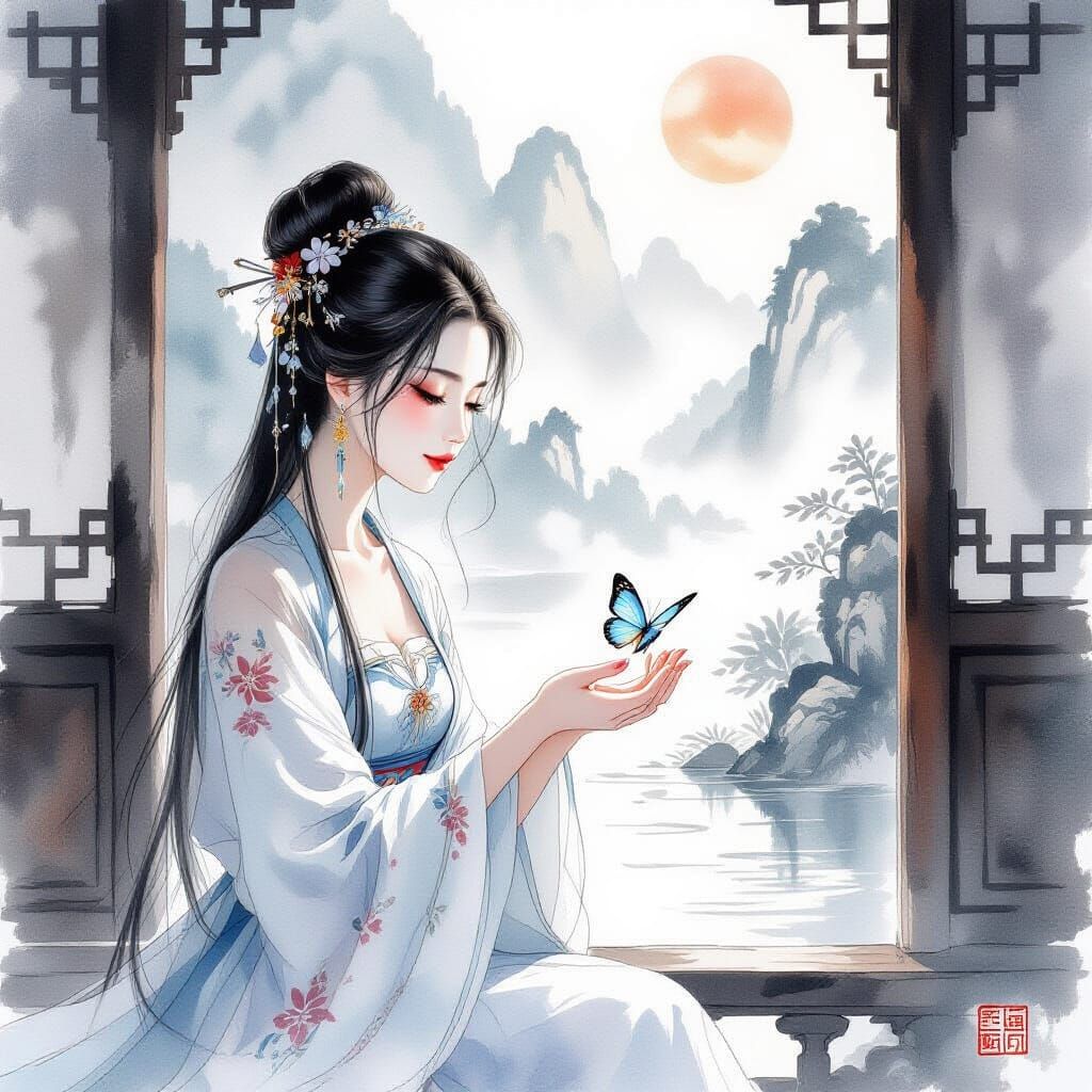 This image depicts a beautiful woman holding a butterfly, symbolizing change and hope. Rendered in a soft watercolor sketch style with delicate shading and transparent layers.