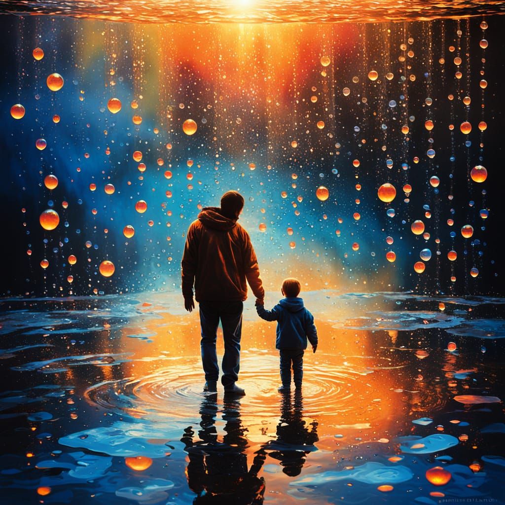 This image shows a father and child in a loving embrace against a dark backdrop. Bold colors and abstract elements combine with shimmering water droplets to create a serene atmosphere.
