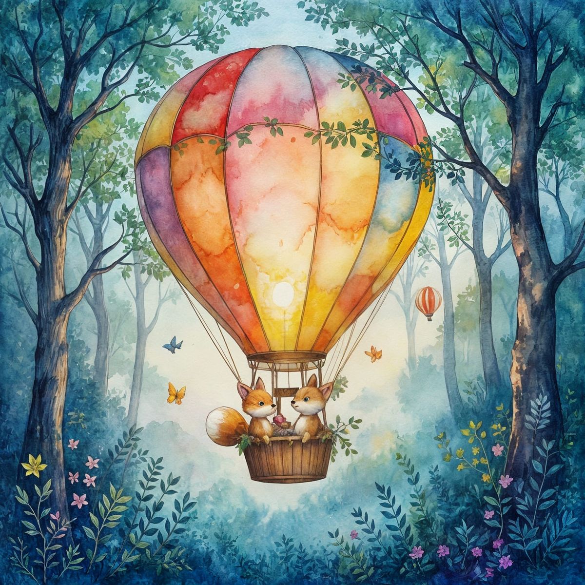This image shows a whimsical hot air balloon featuring woodland creature elements. The artwork is rendered with ethereal, impressionistic qualities, resembling a magical watercolor.